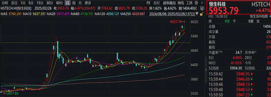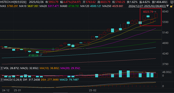 2) 盘面上,恒生科技今日盘中一度涨超5%,突破6000点之上,尾盘有一点回落,最后收涨4.47%。这里就说2点吧: