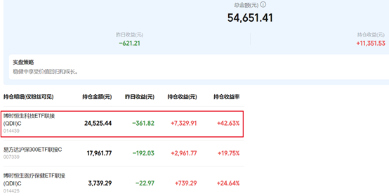 目前36%仓位在恒生科技,持仓2.7w,博时恒生科技为主;沪深300、中证A500合计30%仓位,持仓2w;持有现金2.1w(页面不显示),占比30%。