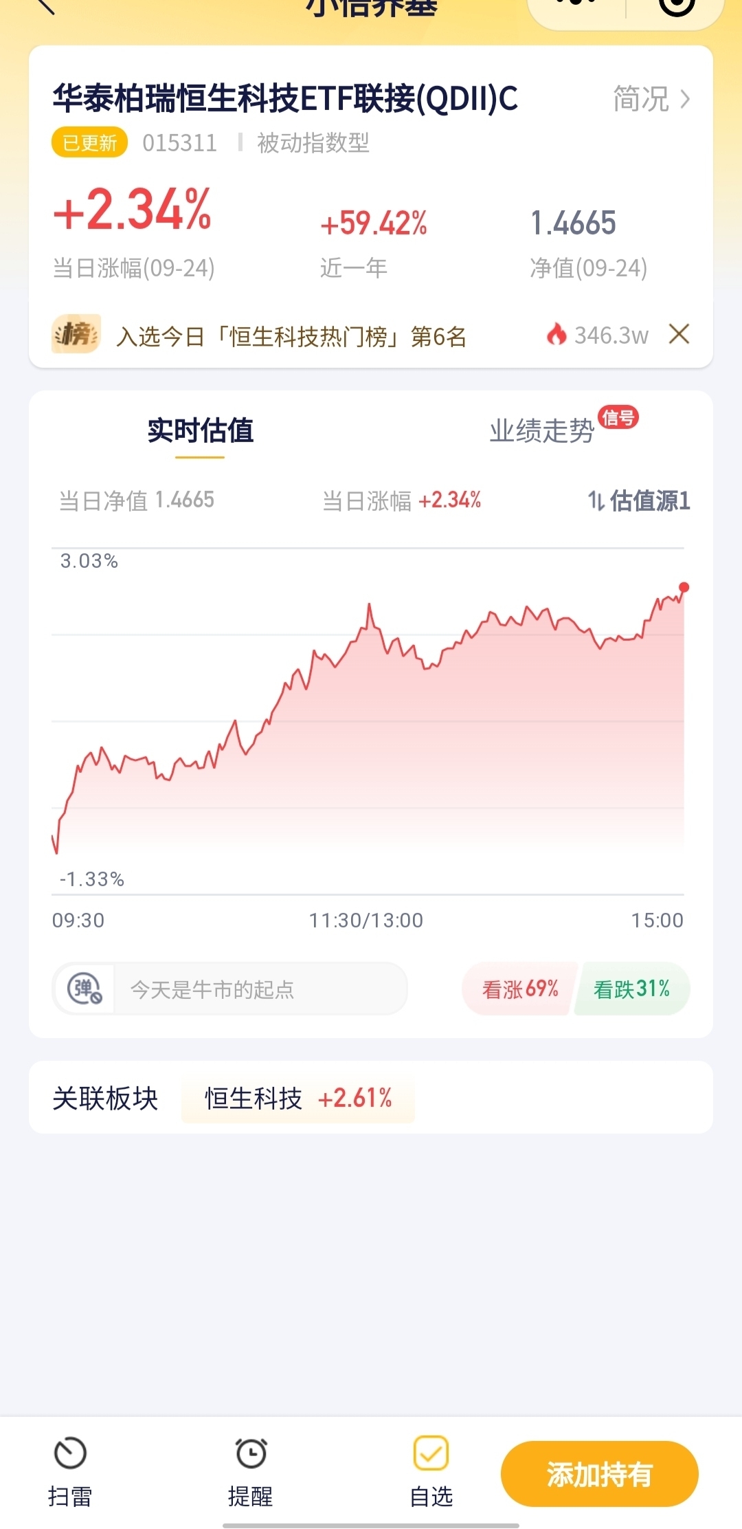 谁今天看恒生科技行情不激动啊?连着盘整三天后直接涨2.53%,收了根大阳线,离近期高点就差一丢丢,成交量还放大了35%。南向资金今天也给力,净流入137亿港元,看来内资也认准了港股的机会。毕竟外资早就行动了,“木头姐”豪掷2100万美元买中概,港股作为投中国资产的首选,现在估值、资金都合适。不想折腾个股的话,华泰柏瑞是个好路子,今天跟着涨了2.34%,近一个月有8.82%的收益,三个月17.45%,跟行情贴合度特别高,新手也能看懂。