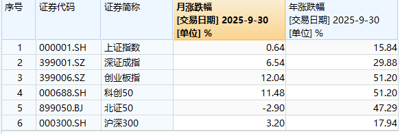 今天是节前最后 1 天,总体还不错,三大指数小幅反弹,科创50涨超 1%,科技牛节奏延续!整个9月,三大指数月线均收涨,其中创业板指本月累计涨超12%创3年多新高,科创50指数涨超11%创近4年新高。