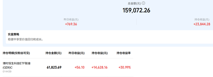 目前主要仓位在恒生科技,持仓6.1w,博时恒生科技为主;沪深300大约持仓2w。