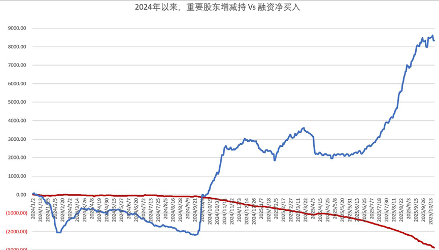 图是融资盘净买入量对比大小非净减持量,单位是亿元,可以看到,大小非的减持虽然汹涌,但依然远不及融资盘的净买入。