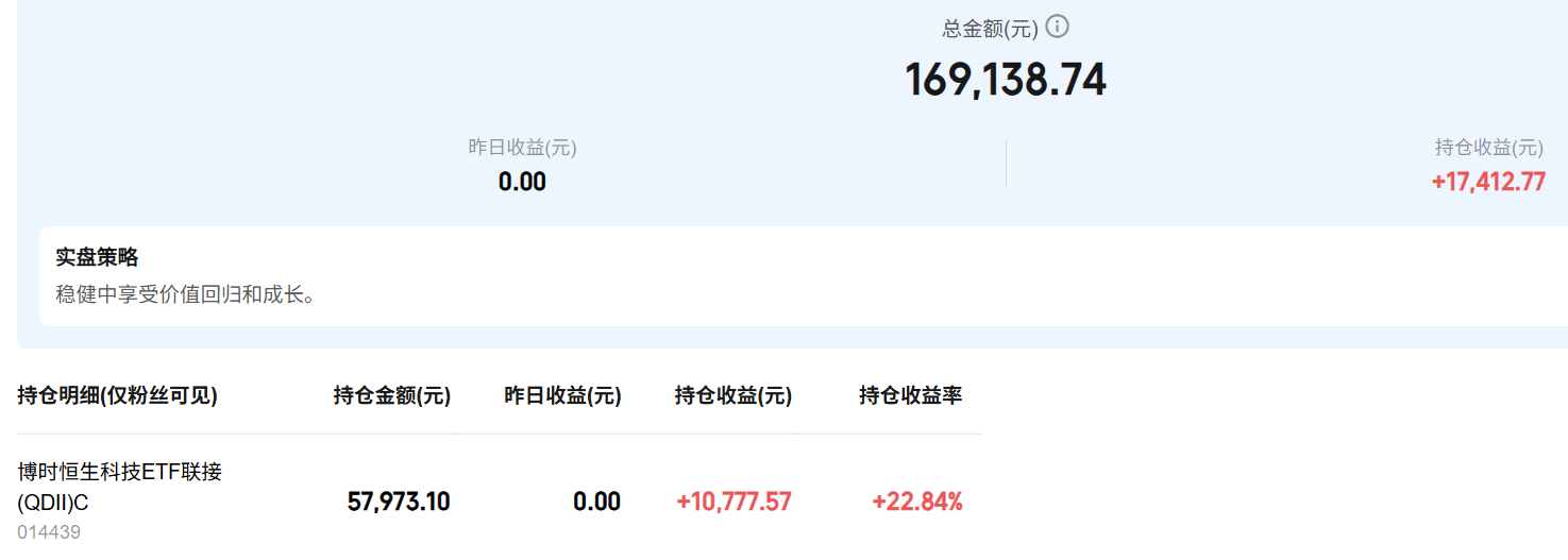 今天股市全线上涨~今日恒生科技+1.83%,预计盈利+1080元,今日港股红利+0.43%,预计盈利+140元,整体来看,今日账户预计+1300元,实盘账户资产预计将达到85440元,目前进度+42.4%。
