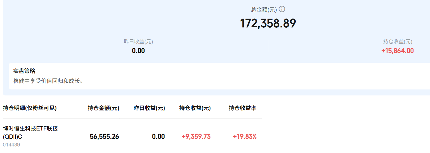 希望今天的探底回升能带来一波反弹,今日恒生科技+0.24%,预计盈利+140元;今日港股红利+2.11%,预计盈利+800元,整体来看,今日账户预计+960元,实盘账户资产预计将达到83600元,目前进度+39.3%。