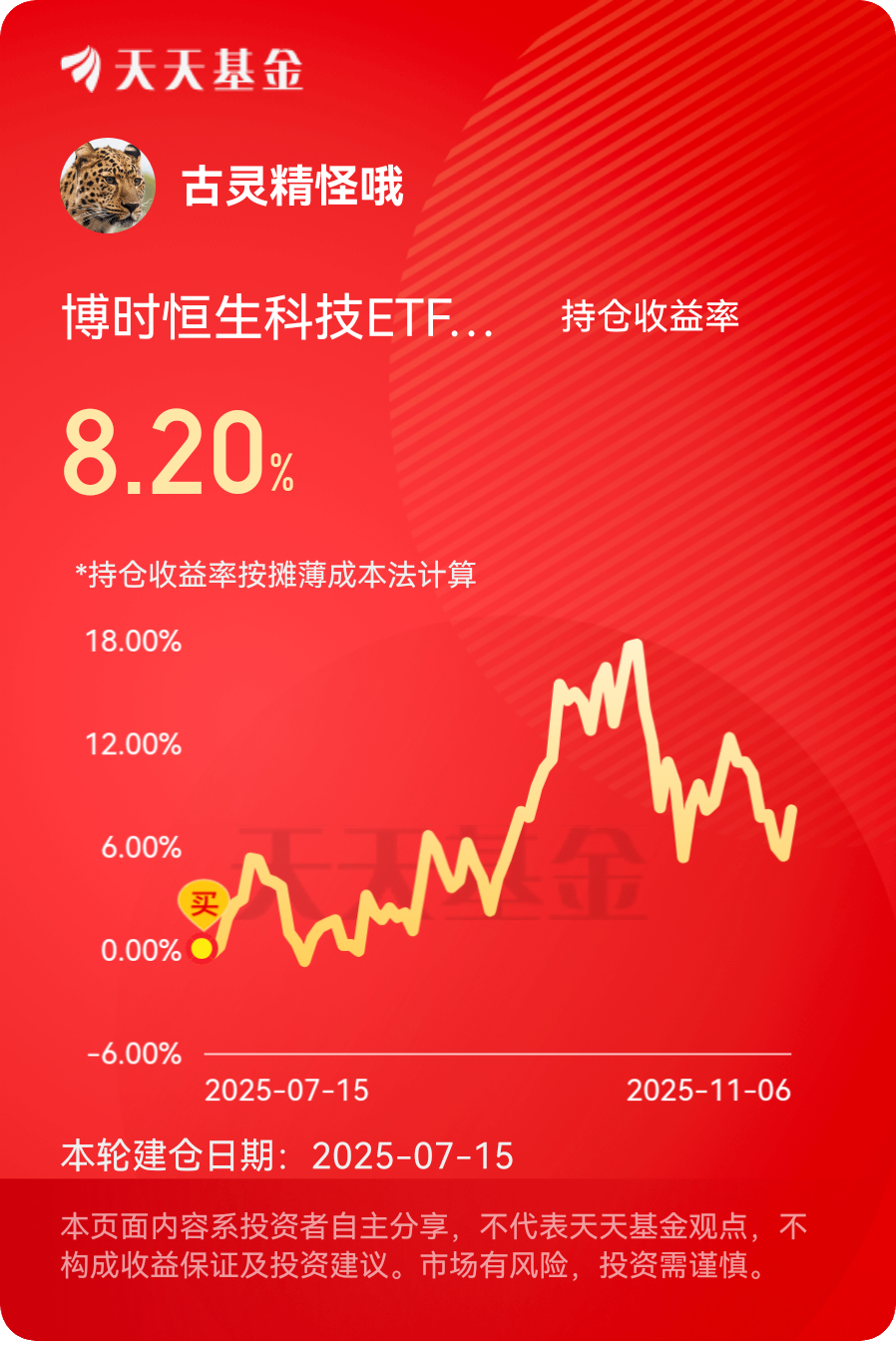#科技小登大揭秘# 不少人在挖科技赛道的潜力机会,想布局科技,$博时恒生科技ETF发起式联接(QDII)C$ 值得重点关注!它聚焦港股科技核心赛道,覆盖AI、云计算、消费电子等高景气领域,既能吃到港股科技股的估值修复红利,又能卡位全球科技创新的主逻辑。为啥选这只?一方面,港股科技龙头经过前期调整,估值处于历史低位,安全边际拉满;另一方面,AI大模型、智能硬件等技术落地加速,科技板块的业绩弹性正在释放。博时恒生科技的优势很明显:持仓聚焦腾讯、美团、小米等科技巨头,同时覆盖中芯国际、商汤等硬科技企业,兼顾成长与稳定性。现在科技“小登”行情渐起,港股作为全球科技资产的估值洼地,后续上涨动力充足——想上车科技赛道的朋友,把这只基加入自选,大概率能跟上这波科技红利!#晒收益#