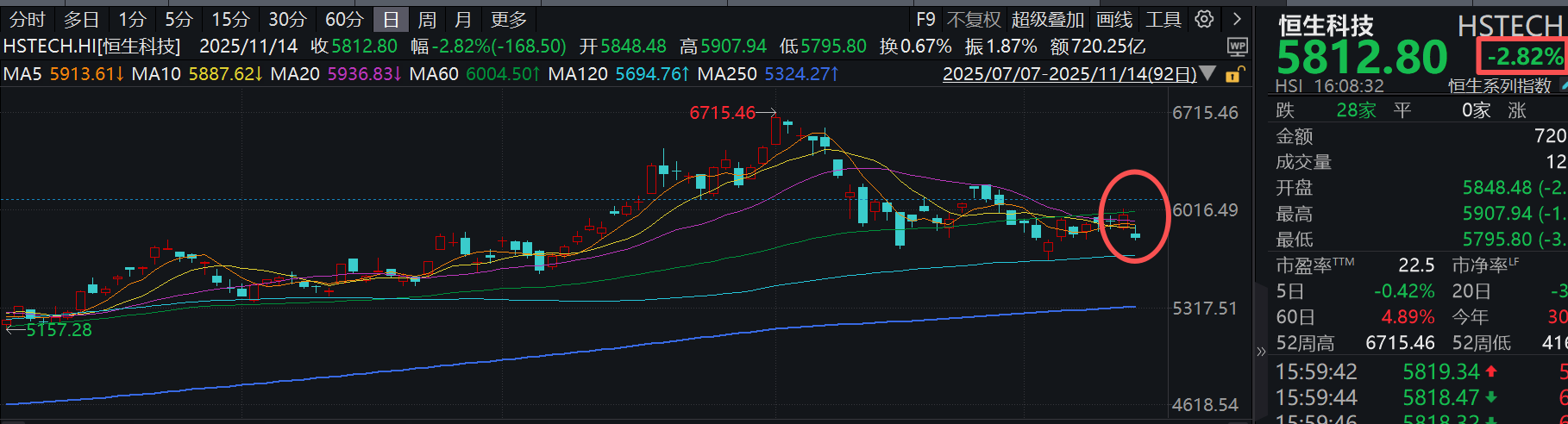 1)盘面上,受隔夜美股大跌影响,恒生科技今天低开低走收跌3.82%,再次跌破20日均线,接下来看下方120日均线、250日均线的支撑力度了。
