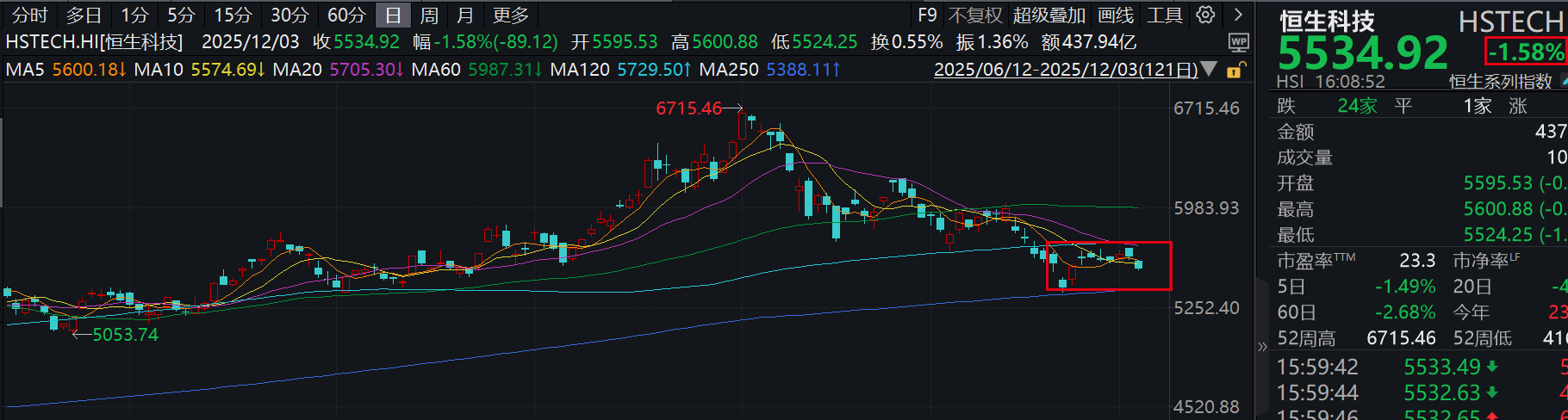 1)盘面上,恒生科技今天低开低走,收跌1.58%,走的非常弱,目前看可能要再次考验下方250日均线的支撑情况了,仓位轻的话,逢250日均线支撑可以加点~