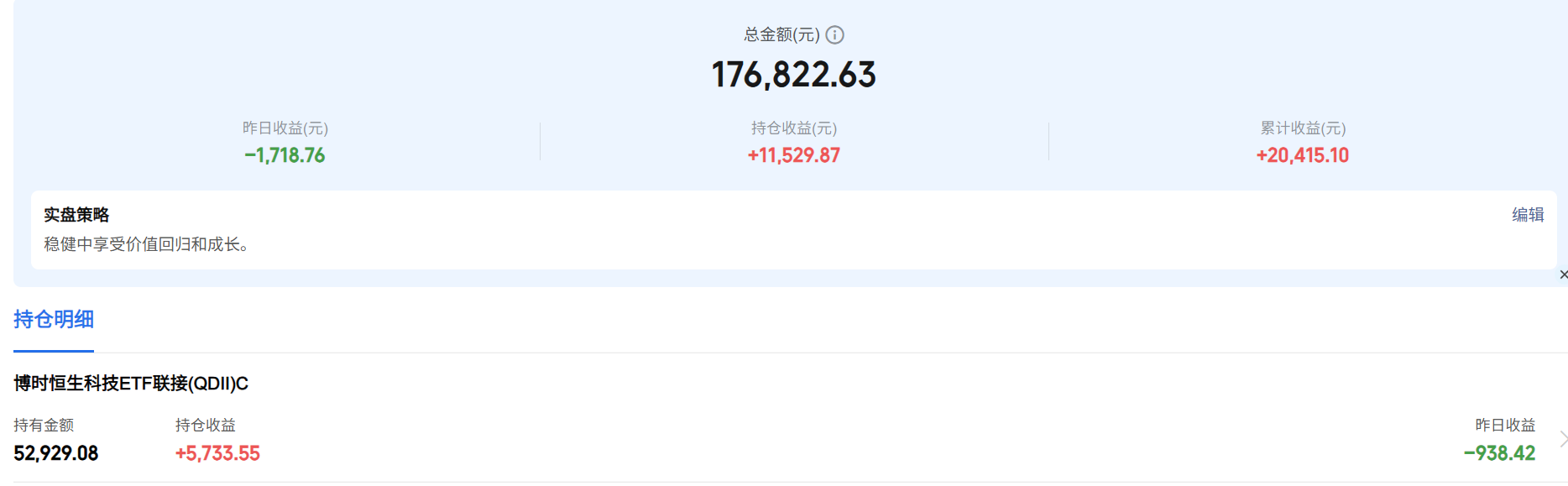 大家进入股市/基市的时候,有没有想过,该如何从这个市场赚钱?这钱就该你赚吗?今日恒生科技+0.48%,预计盈利+260元;今日港股红利-1.38%,预计盈利-580元,整体来看,今日账户预计-350元,实盘账户资产预计将达到77350元(昨天-1700),目前进度+28.9%。