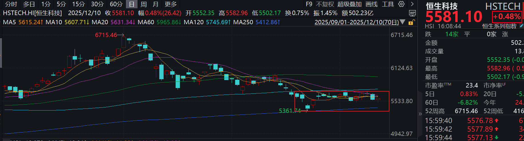 1)盘面上,恒生科技今天探底回升,近期窄幅震荡走势明显,上方有20日均线以及120日均线压制,下面也有250日均线支撑,后面看方向上的选择了~