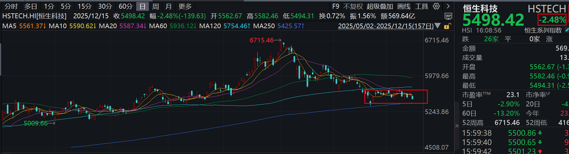 1)盘面上,恒生科技今天低开低走,收跌2.48%,走势非常弱,再次跌破20日均线,临近250日均线附近,后面主要看250日均线的支撑情况了~