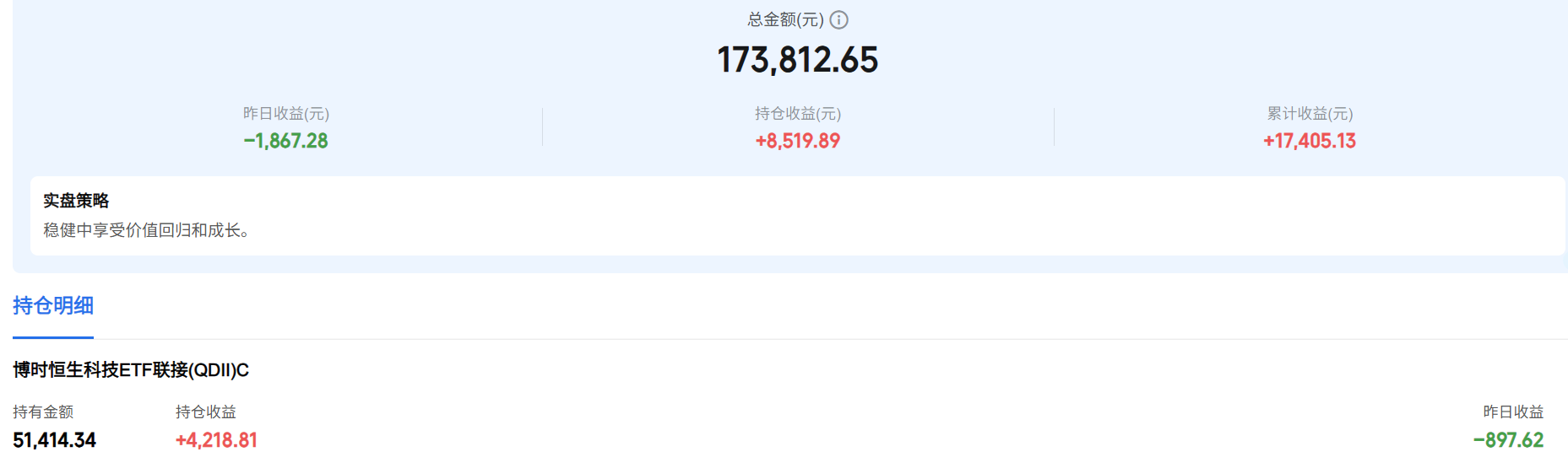 没必要过于恐慌了!今日恒生科技+1.03%,预计盈利+530元;今日港股红利+0.40%,预计盈利+160元,整体来看,今日账户预计+900元,实盘账户资产预计将达到76150元,目前进度+26.9%。