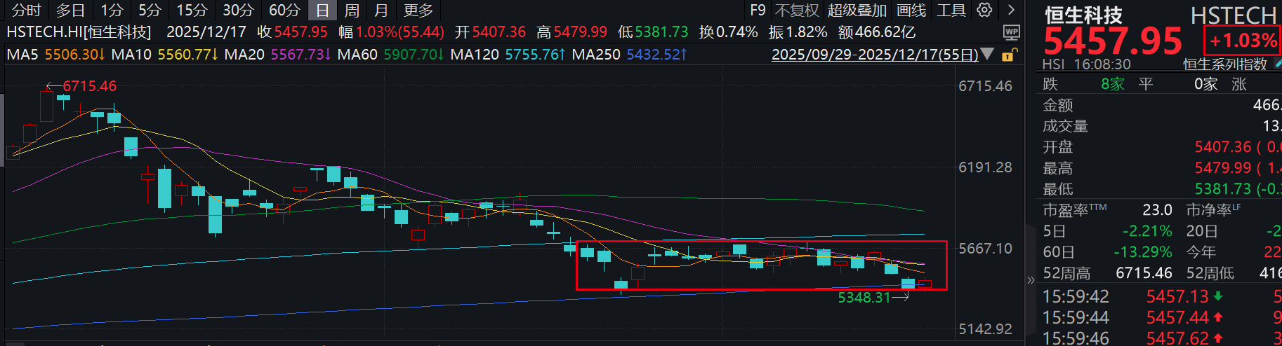 1)盘面上,恒生科技今天震荡反弹,午后拉升明显,今日重新站上250日均线,后面几天主要观察能否继续收在250日均线上方~