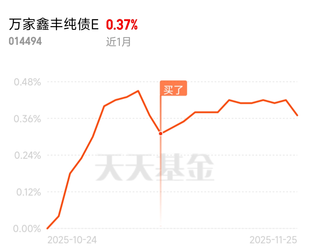 近一个月这波涨势看着还可以,接下来求稳是主要的!$万家鑫丰纯债E$七免随时都可入