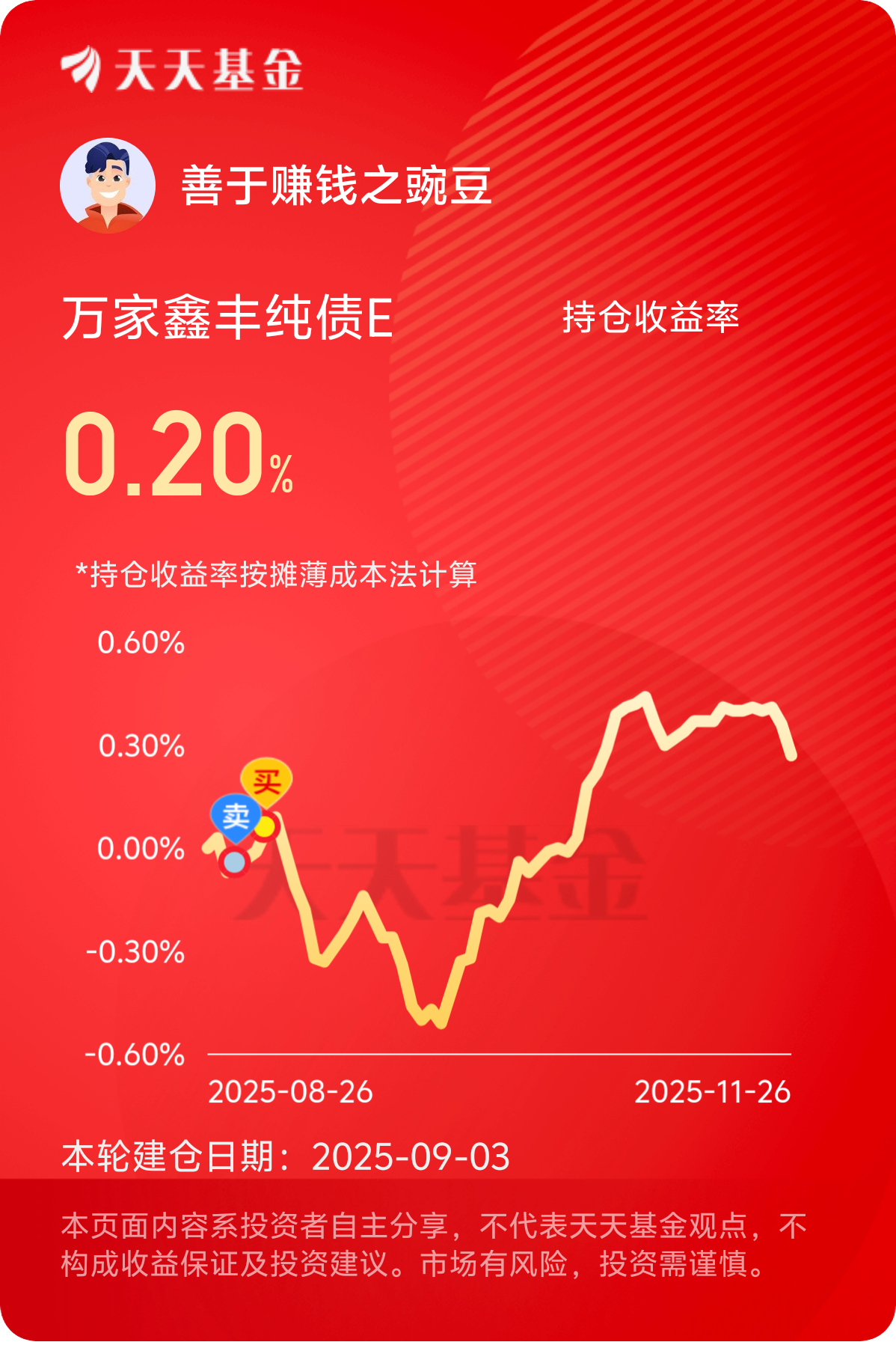 股市经常上窜下跳,还是要配置一些稳健的债基,万家鑫丰债券长期表现不错,继续加一些