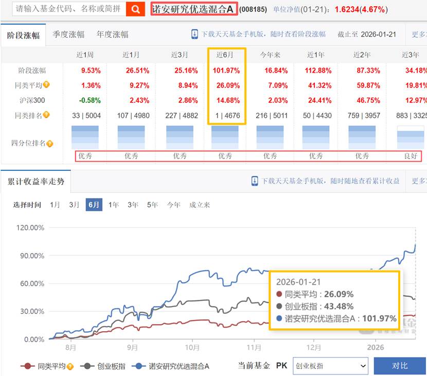 在这轮行情中,诺安研究优选混合A表现尤为突出,诺安研究优选混合A最近半年涨了101.97%,在4676只同类基金中排第一。什么概念?同类平均才涨26%,沪深300涨14.68%,这只基金直接翻倍。