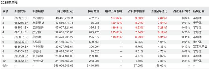 正好今天四季报披露,翻开持仓就明白了,基金经理邓心怡和周靖翔把钱全投在半导体上,前十大重仓股全是芯片相关。这种集中持仓虽然激进,但在AI爆发的当口,确实吃到了肉。