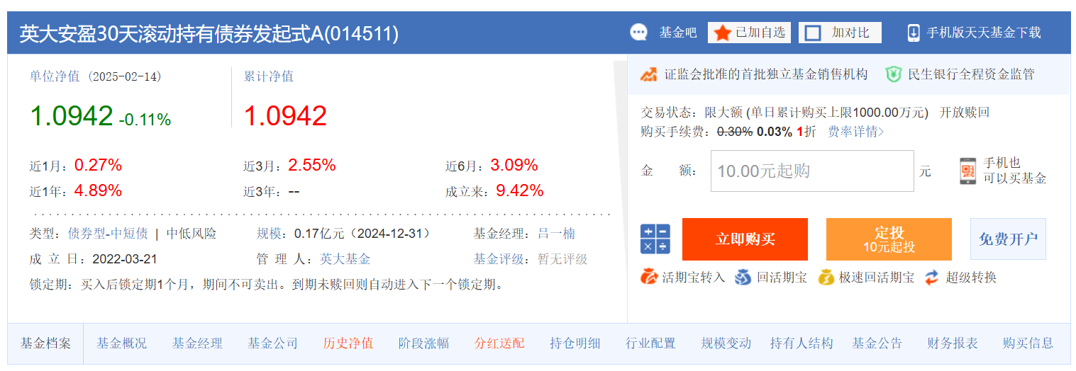 陪伴安盈的第11天英大安盈30天滚动持有债券发起式A(014511)具有一定的投