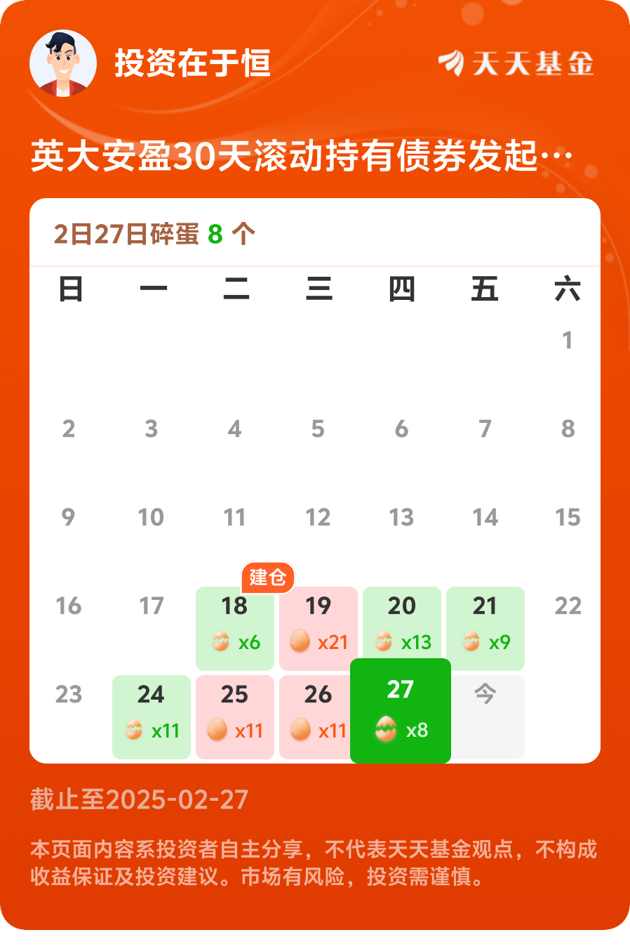 在2025年这个充满机遇与挑战的投资年份里,英大安盈30天滚动持有债券A凭借其稳健的收益、精妙的投资策略、灵活的运作方式以及专业的团队保障,成为投资者不可忽视的优质选择。无论你是初涉投资领域的新手,还是经验丰富的投资老手,都不妨将英大安盈30天滚动持有债券A纳入你的投资组合,开启稳健投资的新征程。@英大基金 $英大安盈30天滚动持有债券发起式C$ #晒抱蛋收益#