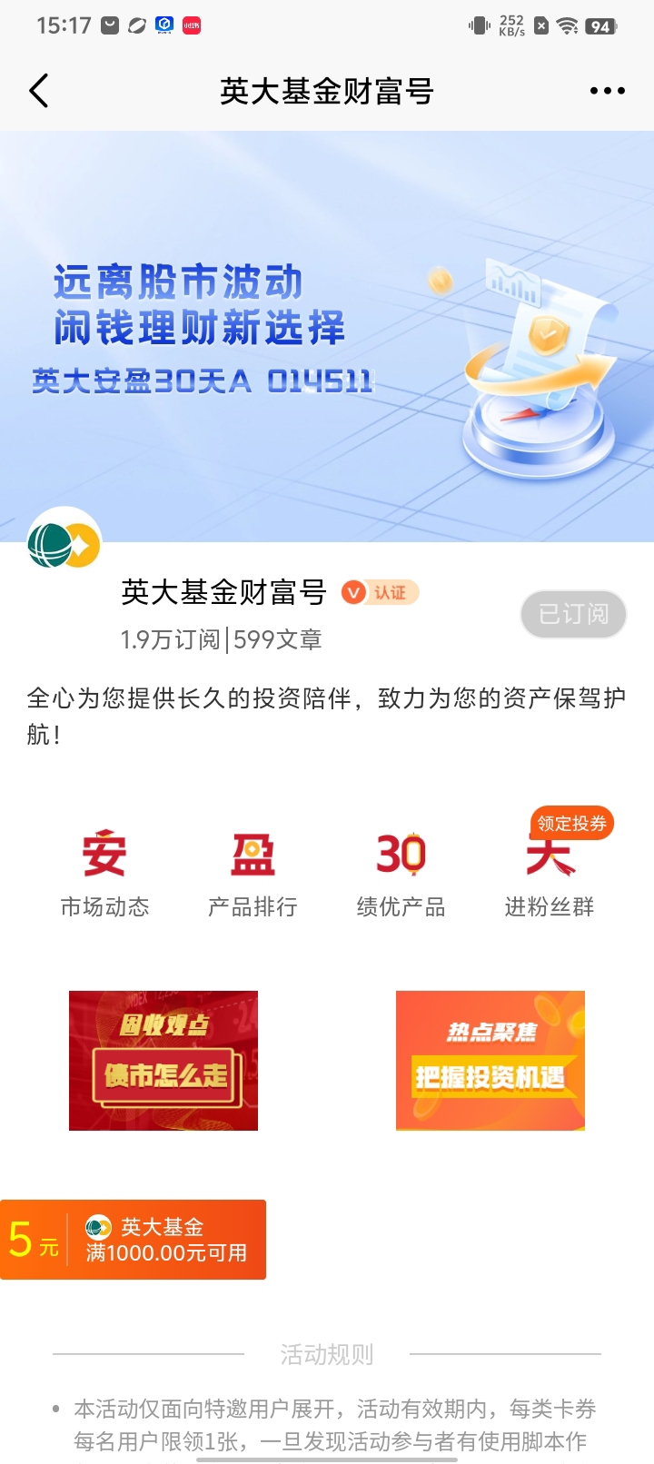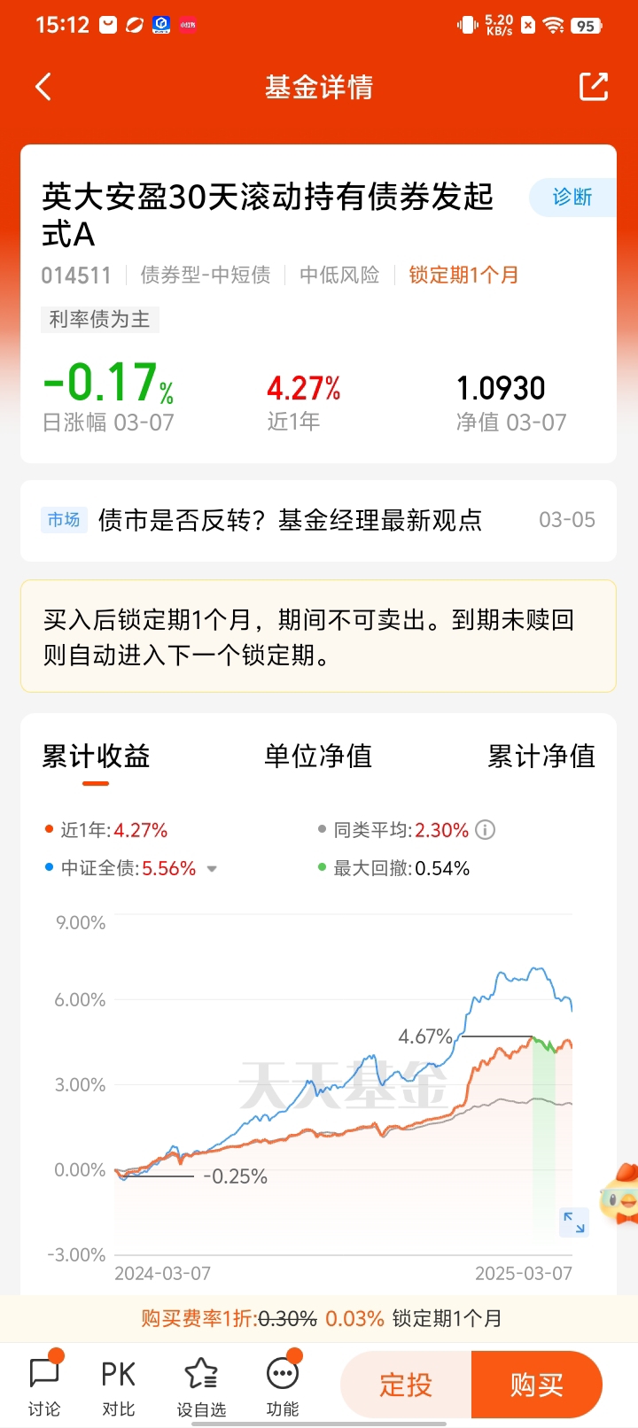 各类纯债基金的业绩普遍回暖,投资者的配置热情日益高涨。英大安盈30天滚动持有债券A也在这次行情下脱颖而出,基金在综合考虑基金资产收益性、安全性、流动性和严格控制风险的基础上,通过积极主动的投资管理,力争实现超过业绩比较基准的投资收益。