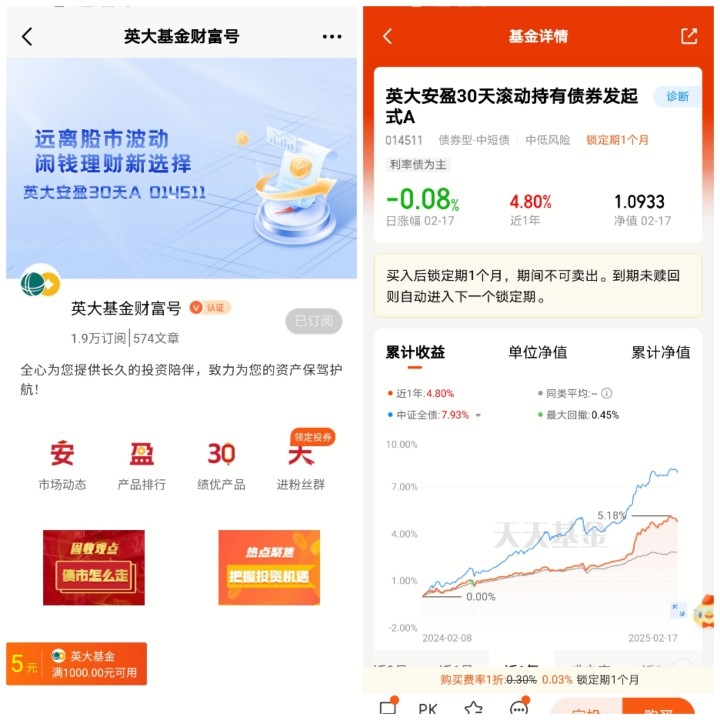 $英大安盈30天滚动持有债券发起式A$ 长期保持平稳上涨,远离股市波动,持有可以在长期持有的过程中充分发挥债基波动小收益稳定风险低的特点,作为投资组合的底仓配置,长期持有可以规避市场波动,平滑投资收益损失,降低投资风险与成本,实现资产的稳健增值,让闲散资金积少成多。
