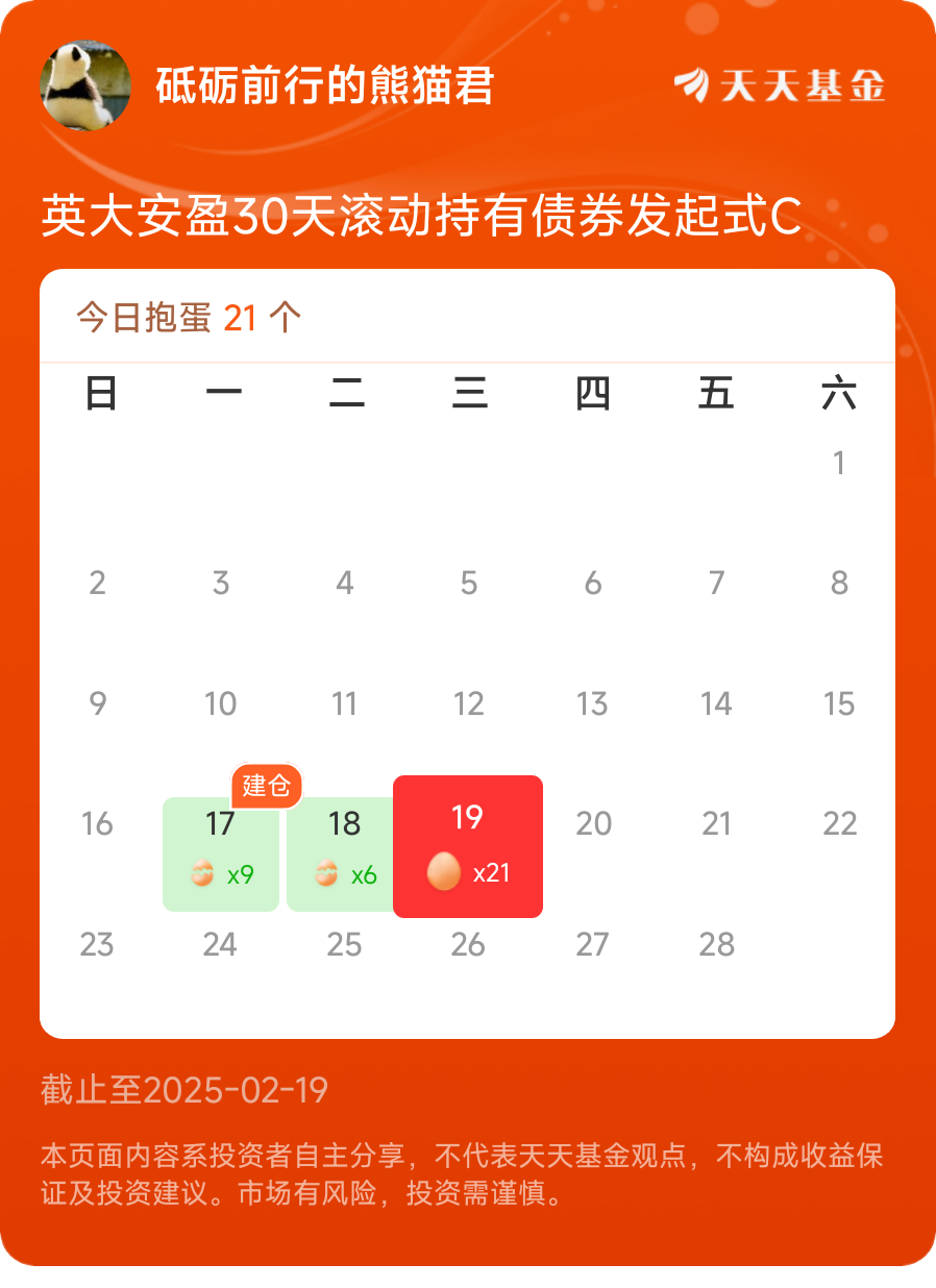 今日$英大安盈30天滚动持有债券发起式C$ 收蛋21个!!!开心(^o^)
