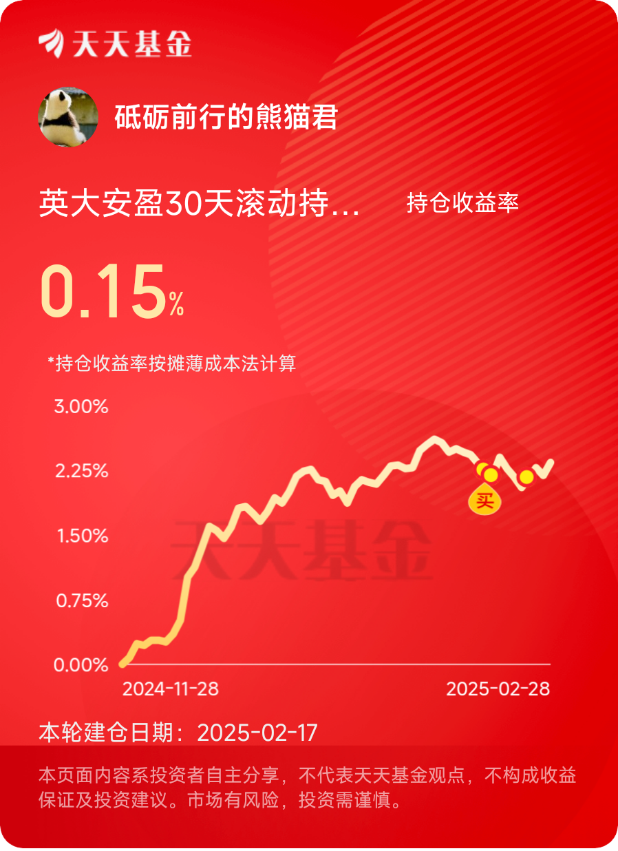 在纷繁复杂的金融市场中,英大安盈30天如一颗璀璨的新星,以其低波稳健、灵活便捷的特点,吸引了众多投资者的目光。我,作为这股理财新潮流中的一员,近期也加入了英大安盈30天的投资大军,每周定投100元,短短时间内便收获了1%的收益。今天,就让我为大家详细测评这款产品,分享我的持有体验与未来展望。