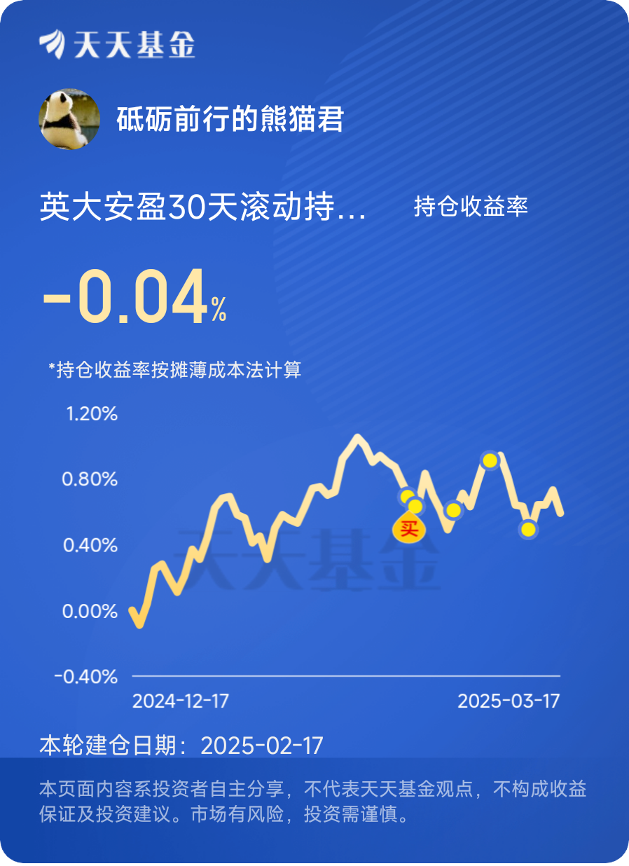 我于最近买入了英大安盈30天,选择每周定投100元。虽然金额不大,但每次看到账户里的收益一点点增长,心里都充满了喜悦。到目前为止,我已经收获了1%的收益,虽然不多,但足以让我对这款产品充满信心。