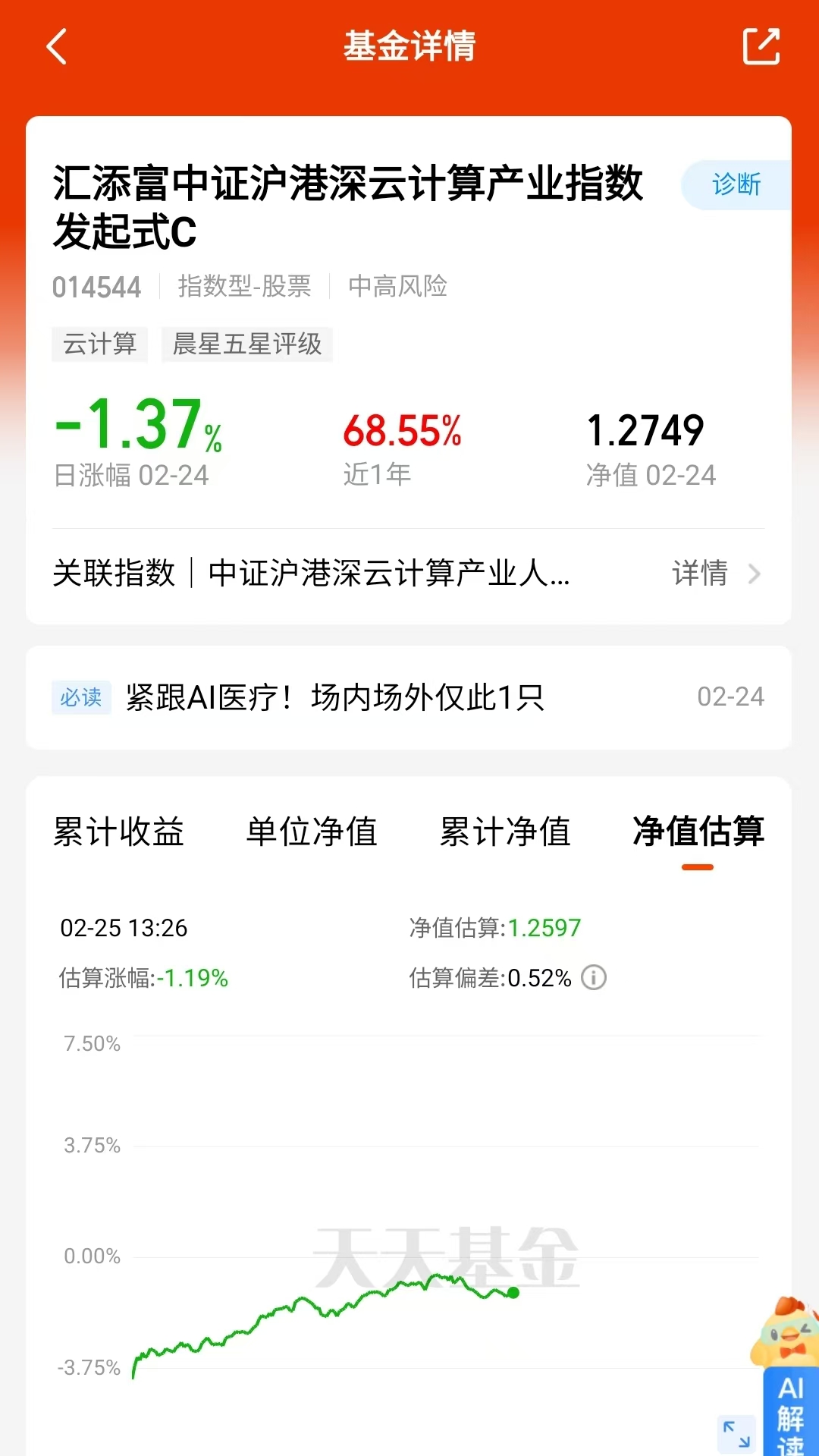 我觉得随着现在科技不断的快速发展,云计算作为新一代信息技术的重要分支,已经成为推动我国数字经济发展的关键力量。这一部分也是值得大家关注的。比如$汇添富中证沪港深云计算产业指数发起式C$ 由于这两天回调,但是近一周涨幅还是在3.36%,近半年涨幅82.7%,这业绩比华泰柏瑞都要好。汇添富家的产品优势主打就是费率低,更具性价比。而且这只基金持仓涵盖了我国云计算产业链的多个环节,包括硬件设备、软件平台、云计算服务等领域。持仓全面,更能实时掌握行业发展情况,更稳健。今天盘中估值下跌,可以考虑上车了。