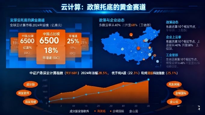 很多人觉得云计算“太虚”,不如消费、新能源“实在”,但我算过一笔账:2024年全球云计算市场规模突破6500亿美元,中国占比18%,年增速25%(来源:IDC),比全球平均增速高8个百分点;政策端“东数西算”工程已经落地10个国家枢纽节点,企业上云率从2020年的40%涨到2024年的68%(来源:工信部)——简单说,这是个“政策托底、需求爆发”的赛道,不是空中楼阁。