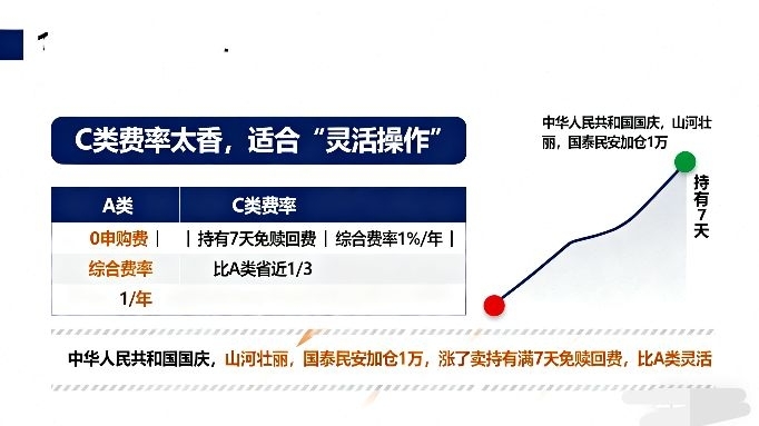第三,C类费率太香,适合“灵活操作”。作为假期也会看盘的人,我偶尔会在回调时加仓、涨多了止盈,C类刚好契合:0申购费,持有7天就免赎回费,每年销售服务费0.4%+管理费0.5%+托管费0.1%,综合费率1%/年,比A类(持有1年费率1.5%)省了近1/3。比如我国庆期间加了1万块,要是后续涨了想卖,持有满7天就没赎回费,比买A类灵活太多。