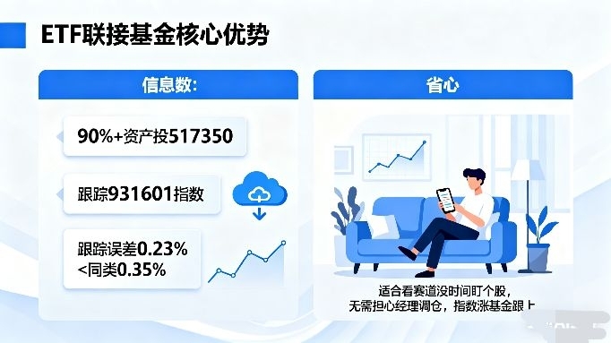 第一,被动跟踪不漂移,省了“猜经理风格”的内耗。它是ETF联接基金,90%以上资产投汇添富中证沪港深云计算ETF(517350),跟踪的就是刚才说的931601指数。我对比过它近1年的跟踪误差:只有0.23%,比同类平均的0.35%低不少(来源:天天基金,截至2024.9)。对我这种“自己会看赛道,但没时间盯个股”的人来说,不用怕基金经理“瞎调仓”,指数涨多少,基金基本能跟上,省心!