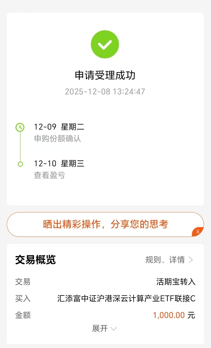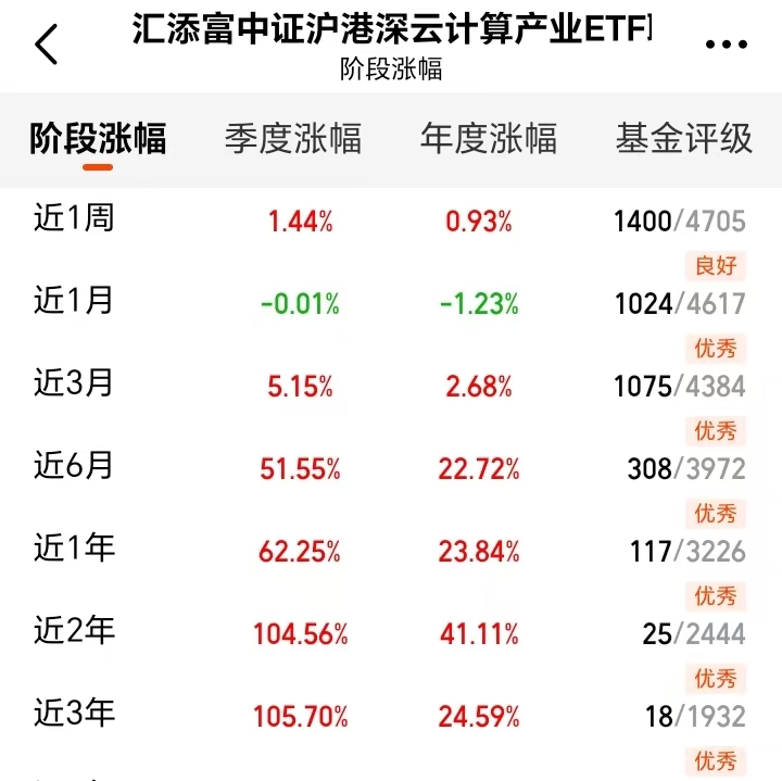 我早就布局了$汇添富中证沪港深云计算产业ETF联接C(OTCFUND|014544)$,上周五小涨0.49%,今天盘中大涨3.69%,现在持仓收益率已经冲超60%啦!关键是它能一键覆盖沪港深三市场,A+H的算力龙头全拿捏,持仓里既有新易盛、中际旭创等CPO龙头,还有腾讯、阿里等港股互联网巨头,而且是唯一包含港股的云计算指数,十大重仓股占比近60%,龙头集中度高。近1年业绩涨幅62.25%,同类排行也很能打。