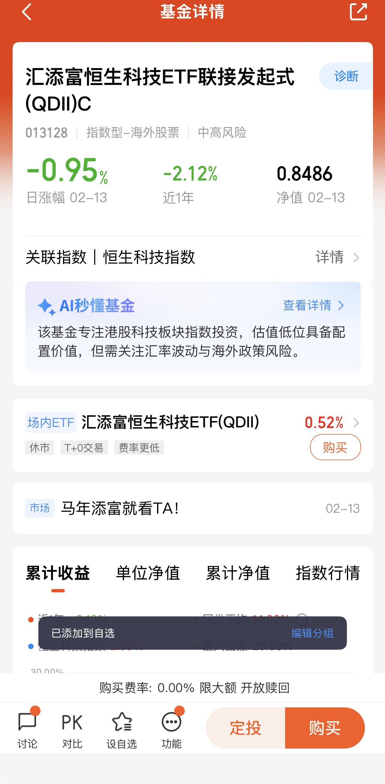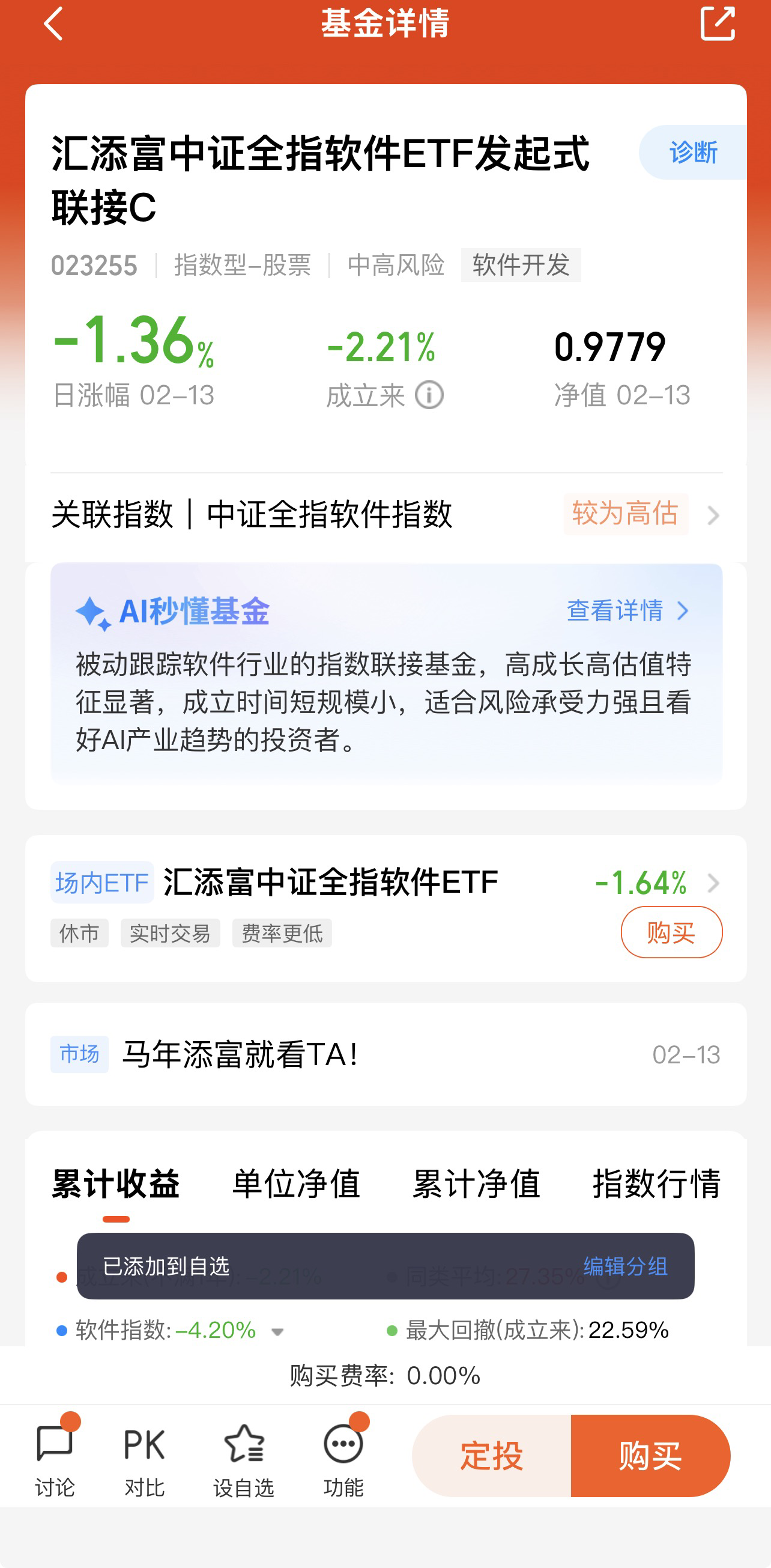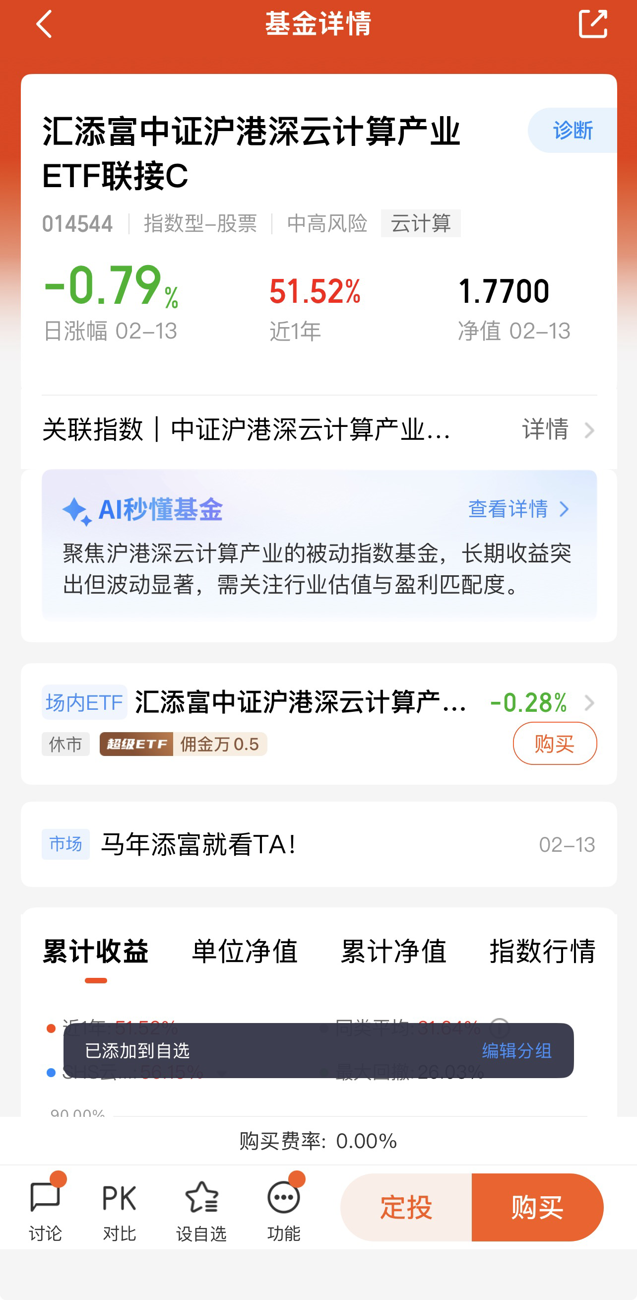 $汇添富中证沪港深云计算产业ETF联接C$ 一方面,基金C类费率友好,无申购费,适合小额定投(每月固定投入小额资金),通过定投平滑市场短期波动,降低投资成本,适合资金量不大、想长期积累资产的投资者;另一方面,基金申赎灵活,适合对云计算、AI板块有一定判断,想进行波段操作、捕捉短期板块行情的投资者。此外,对于持仓中以债券、货币基金为主,希望配置一定比例成长型资产、优化持仓结构、分散风险的投资者,该基金也可作为优质的配置标的,提升整体持仓的长期收益潜力。