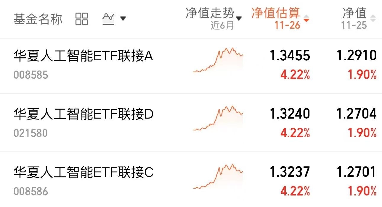 连红2天,今天涨势真猛啊,当前上涨超4%,$华夏人工智能ETF联接C$布局行业优