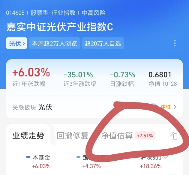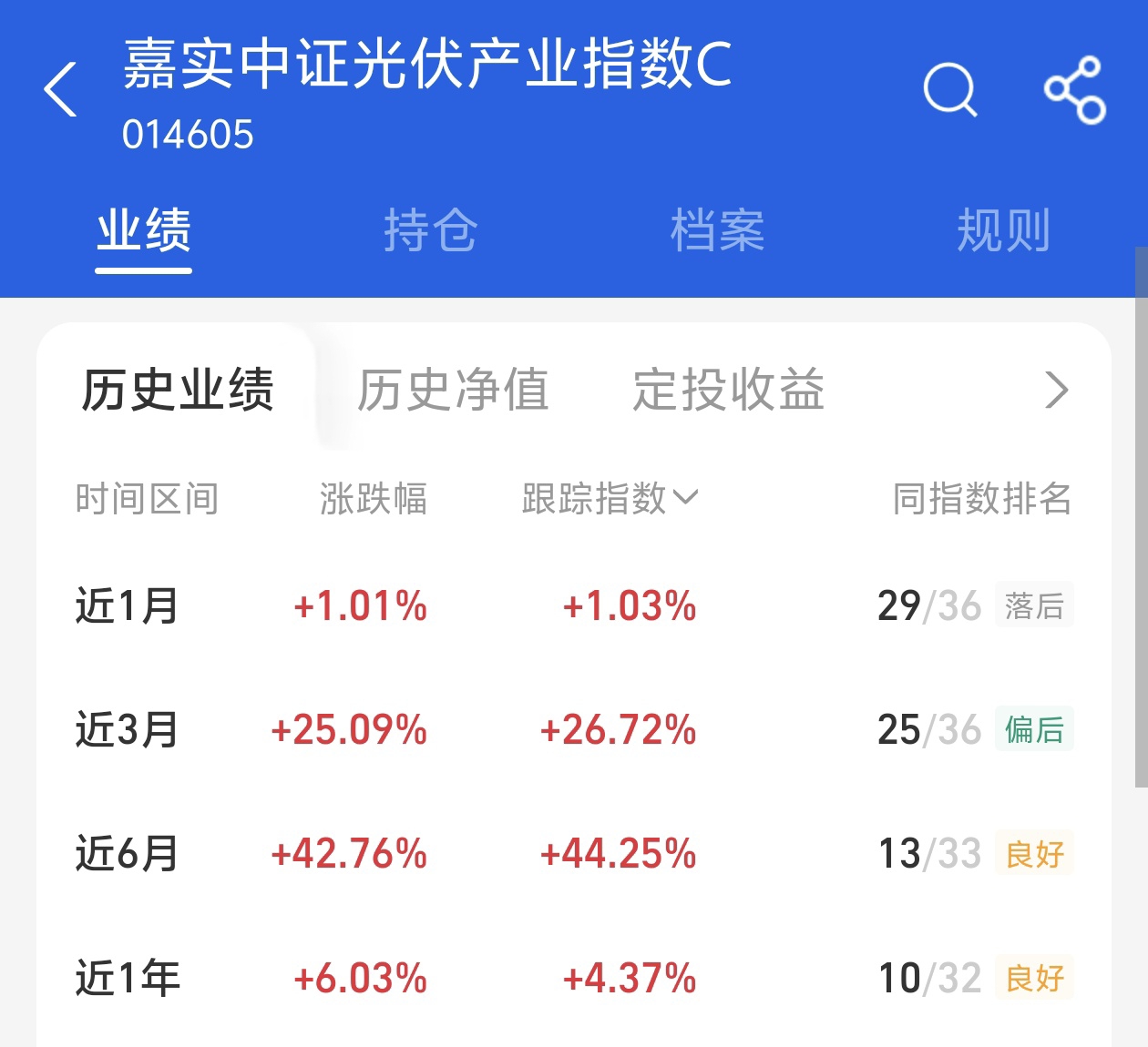 $嘉实中证光伏产业指数发起式C$ 目前的估值上涨了7.51%,收益率高。近三个月的收益率高达25.09,近6个月的收益率高达42.76%,盈利能力强。目前随着光伏技术不断迭代,技术进步有助于降低成本,提高性能,增强光伏产品的市场竞争力。目前国外市场需求暴增,光伏桩基同比增长。叠加政策利好,地方政府对光伏安装补贴提高。目前光伏板块估值处于历史较低水平,未来有巨大的修复增长空间。长期持有,投资性价比高,期待后期收益!