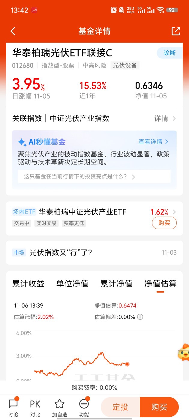 今天光伏板块的表现太亮眼了,多只个股大涨,甚至有龙头股冲击涨停,成交量也明显放大,资金进场的信号很强烈。这波行情的核心逻辑就是“反内卷+基本面改善”:以前行业无序扩张,大家都亏着钱做生意,现在政策出手整治,低价竞争少了,企业利润开始修复。而且全球能源转型是大趋势,光伏作为清洁能源的主力,国内海外订单都排到后面了,装机量持续高速增长。咱们普通人想布局这个赛道,华泰柏瑞是个靠谱的工具,它精准跟踪光伏指数,能紧跟行业趋势,不会错过板块上涨的机会。管理费率低,能省下不少成本,C类份额短期操作也划算,不用纠结个股涨跌,跟着整个行业的复苏节奏走,比自己瞎折腾靠谱多了,感兴趣的可以多关注~