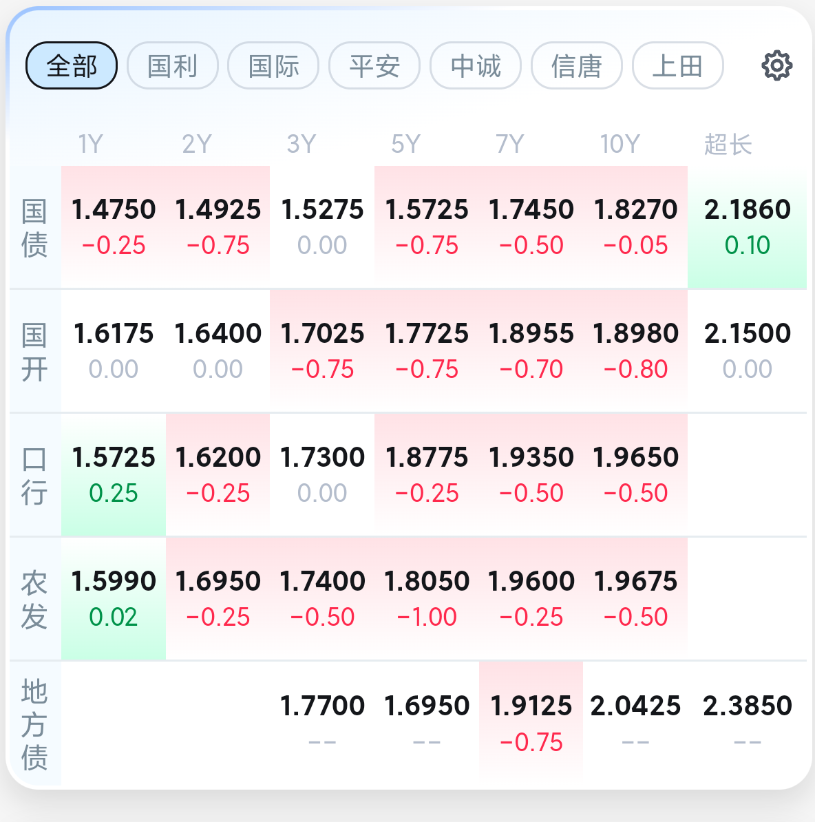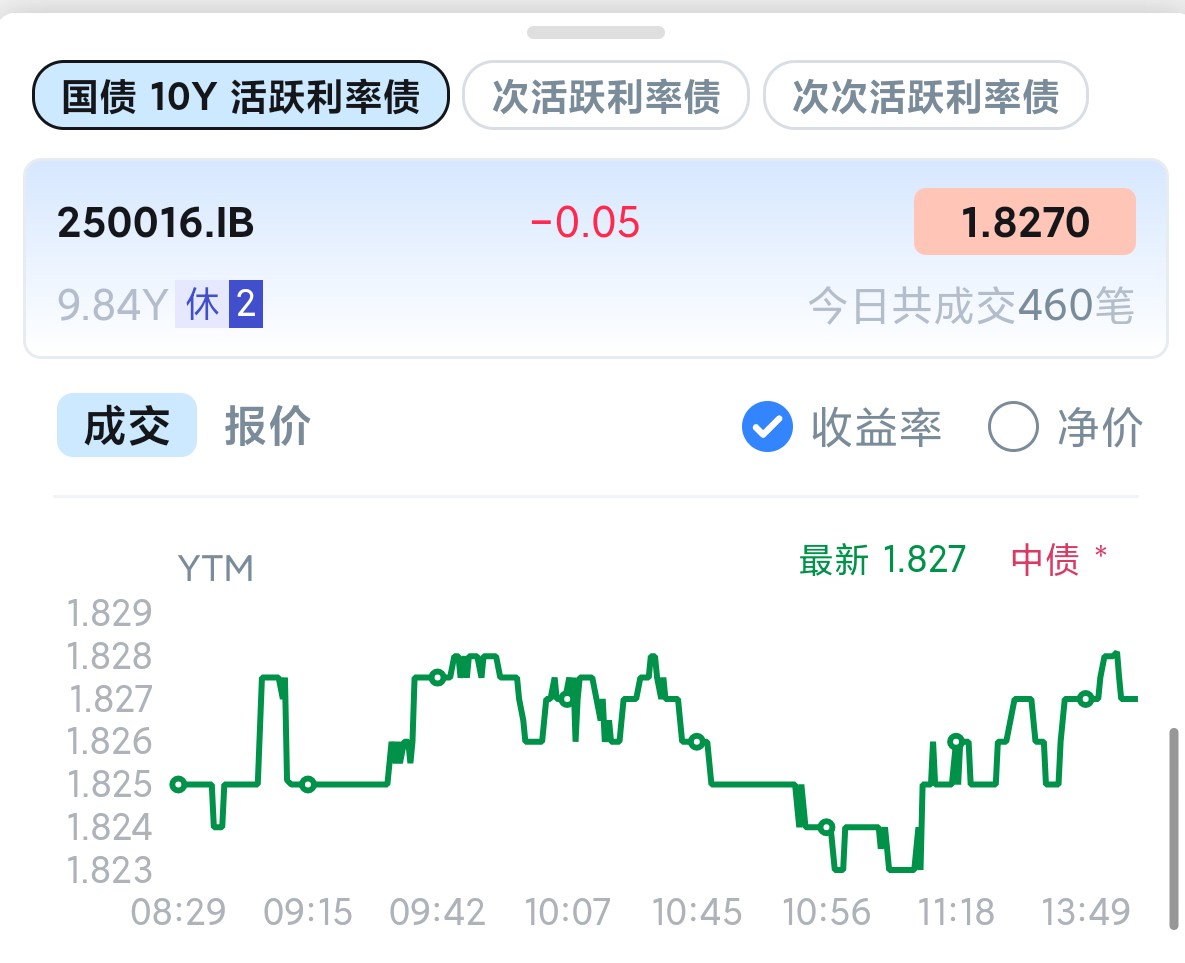 十年期国债收益率:1.827%,-0.05BP(国债收益率越跌,债市越涨)