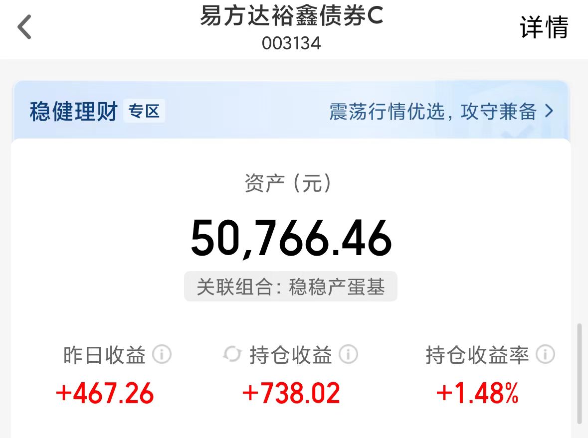 就说姚姚持仓的$易方达裕鑫债券C(OTCFUND|003134)$,这波表现亮眼!昨天直接爆发拿下93个大蛋,节前最后一天股市回调的大背景下,它还能逆势收涨11个蛋!近六个月更是狂揽1152个蛋,作为高波动固收+产品,它的最大回撤仅3.8%,控制回撤能力超强,修复速度快,风险收益比远甩同类平均水平!主打一个能涨抗跌,攻守俱佳,一年能拿下超20%收益,超额水平不用多说,攻守兼备的优势直接拉满。