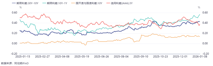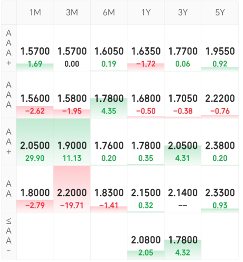 债市今天延续震荡偏暖,午后小有回落。利率债大面积翻红上涨,十年期国债活跃券收益率下行近1BP。国债期货多数回调,信用债则是涨跌分化。期限利差10Y-1Y继续走阔。
