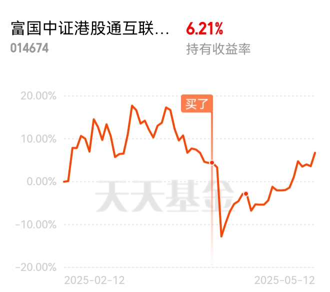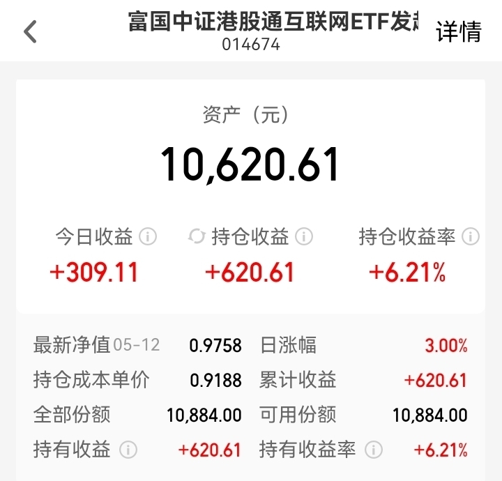今天下午受中美经贸谈判取得实质性进展的联合声明发布,3点开始港股互联网板块大幅拉升上涨,指数最终收涨3.29%,$富国中证港股通互联网ETF发起式联接C$ 我累积盈利超6%了,有持仓的小伙伴今天都吃大肉了。