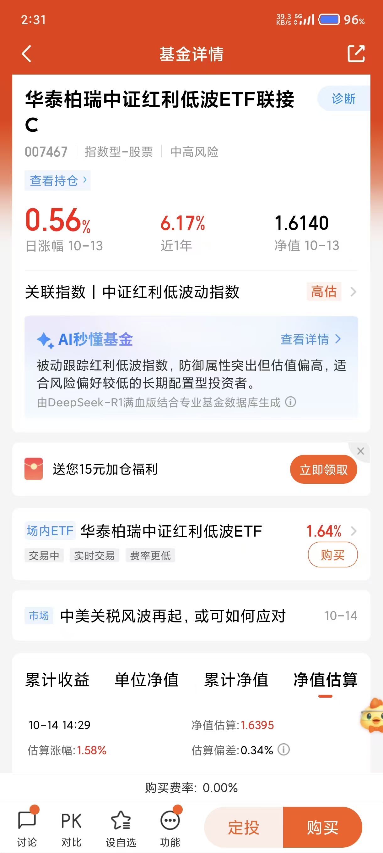 我今天选择加仓1000元华泰柏瑞中证红利低波ETF联接基金C(007467),跟踪的是中证红利低波指数,选取的是现金股息率高、分红稳定的上市公司,高股息率特性使得它在市场下跌时吸引避险资金流入。这只基金不仅回撤小,赚钱效应好,我长期看好它的表现。$华泰柏瑞中证红利低波ETF联接C(OTCFUND|007467)$