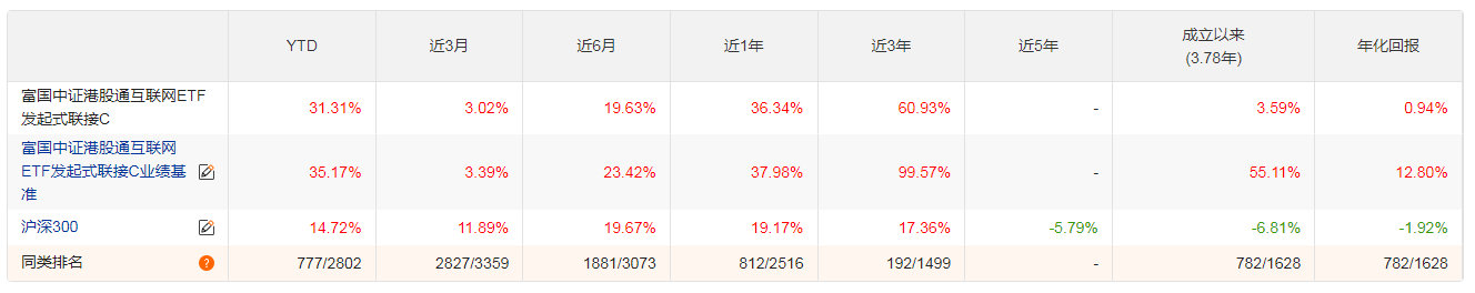 在港股互联网主题基金中,富国中证港股通互联网ETF联接C具有明显的竞争优势。