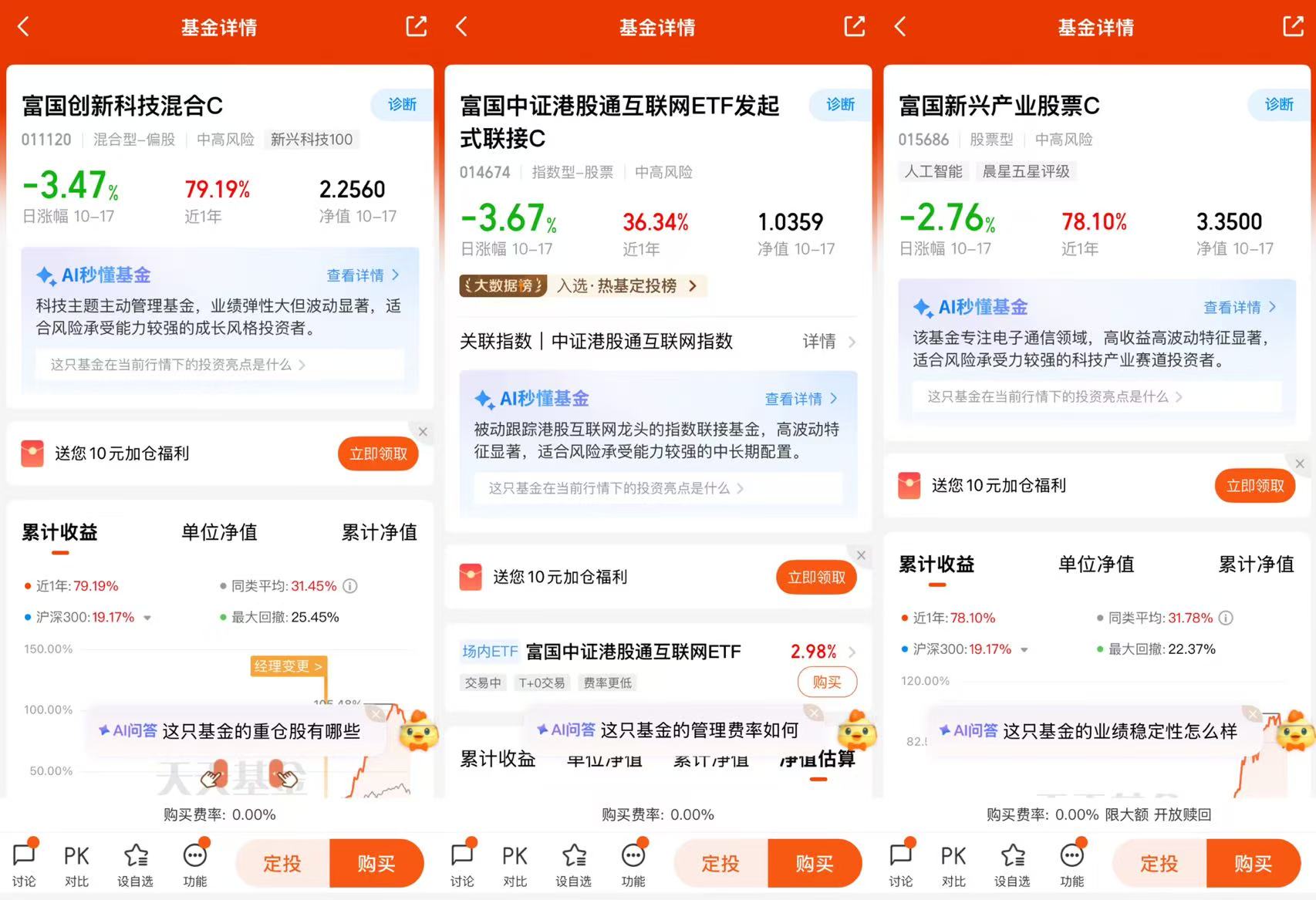 从费率对比看,富国中证港股通互联网ETF联接C的综合费率0.8%,在同类产品中处于较低水平。华夏恒生互联网科技业ETF联接C的综合费率约0.9%,易方达中证港股通互联网ETF联接C的综合费率约0.8%,费率水平相当。但富国基金的优势在于其母基金规模大、流动性好,能够更好地控制跟踪误差。