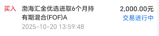 今天我买入$渤海汇金优选进取6个月持有混合发起(FOF)A(OTCFUND|018674)$2000块钱。