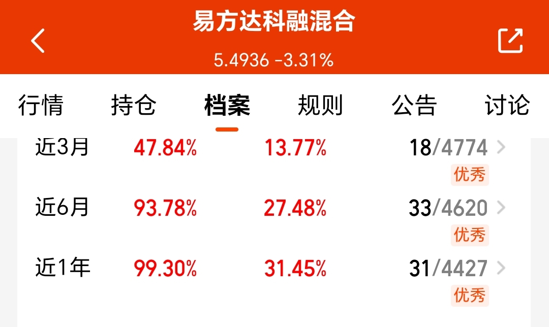 这个基金近3个月涨47.84%,近半年涨93.78%,近一年涨99.3%,在同类基金中排名靠前,我认为还是非常棒的。