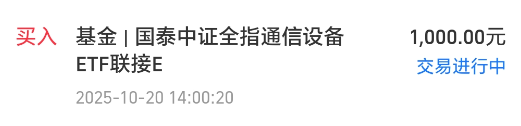 今天我买入$国泰中证全指通信设备ETF联接E(OTCFUND|022500)$1000块钱。