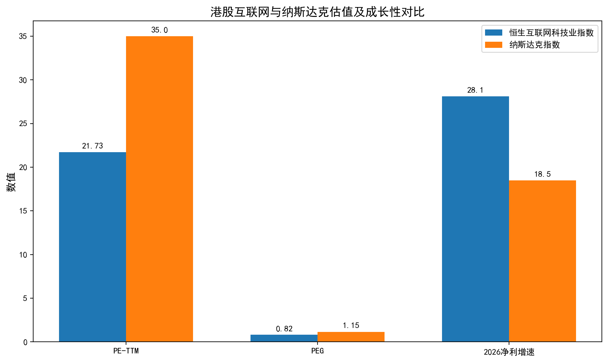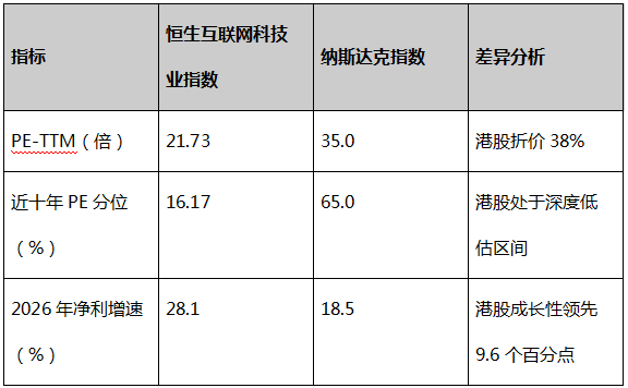 PEG指标更凸显成长性优势。以2025-2026年净利润复合增速测算,恒生科技指数PEG为0.82,低于纳斯达克指数的1.15,显示港股互联网在兼顾成长性与估值性价比上的突出优势。以下为估值对比的关键数据: