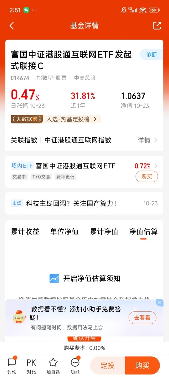 最近港股互联网板块悄悄回暖,我持有的富国中证港股通互联网ETF联接C近2年涨了58%,跑赢大多数同类,69亿大资金都在这儿,估值还处在近5年低位,拿着踏实!