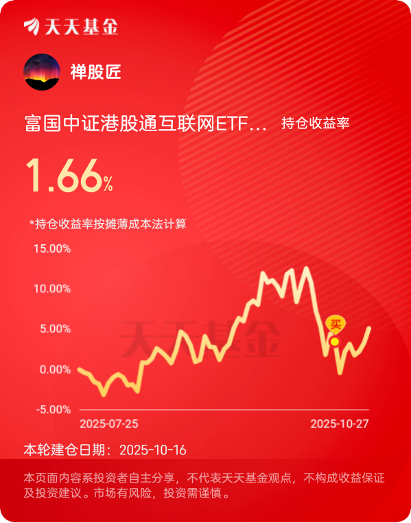 还记得10月中旬的震荡吗?港股互联网板块回调超10%,不少人慌了手脚。但当时果断入手富国中证港股通互联网ETF联接C(014674)的朋友,现在该偷着乐了!$富国中证港股通互联网ETF发起式联接C$