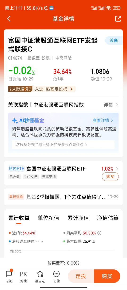基于此,我的投资思路聚焦“指数工具+分批布局+长期持有”三大核心。工具选择上,富国中证港股通互联网ETF发起式联接C 优势显著:其紧密跟踪中证港股通互联网指数,能精准捕捉板块整体机会,避免个股踩雷风险;且免申购费,持有满7天免赎回费,费率成本低于多数主动管理基金,特别适合应对板块波动的定投操作。